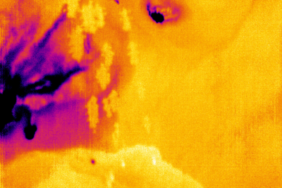 These whale “signatures” are created when water gets disturbed as the whales swim through it and create upwellings of different water temperatures. Recorded in infrared, the resulting image is a dancing, bright-hot painting with patterns of red, orange, yellow, purple and blue.
